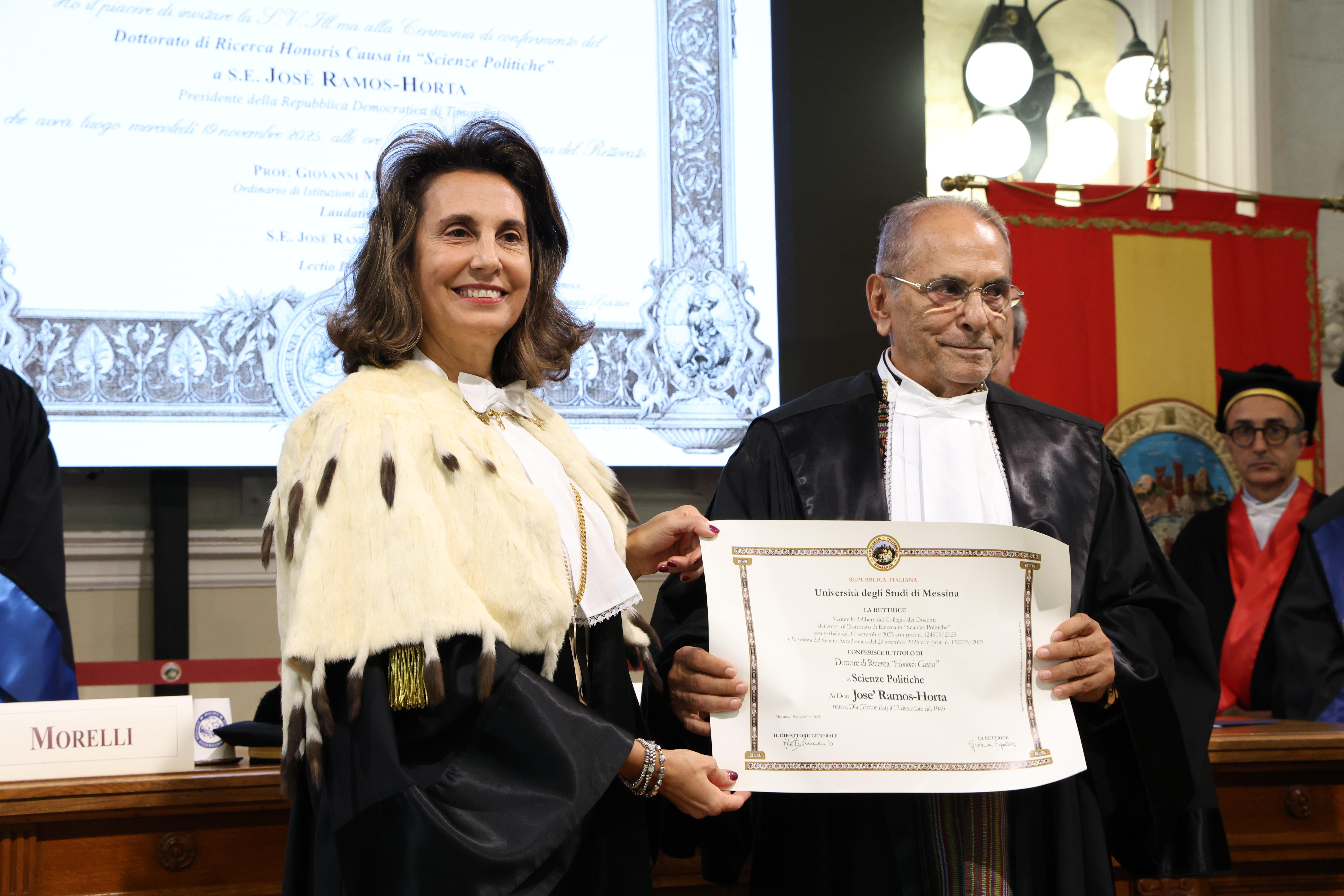 “Esprimo profonda gratitudine al Presidente Ramos-Horta – ha commentato la Rettrice – per la sua presenza. Egli è un simbolo di valori fondamentali come la pace e la dignità umana e per il nostro Ateneo è un piacere accoglierlo di fronte ad una vasta platea. Rivolgo un caloroso saluto anche a Monsignor Marco Sprizzi, ospite già in altre occasioni dell’Università di Messina”.