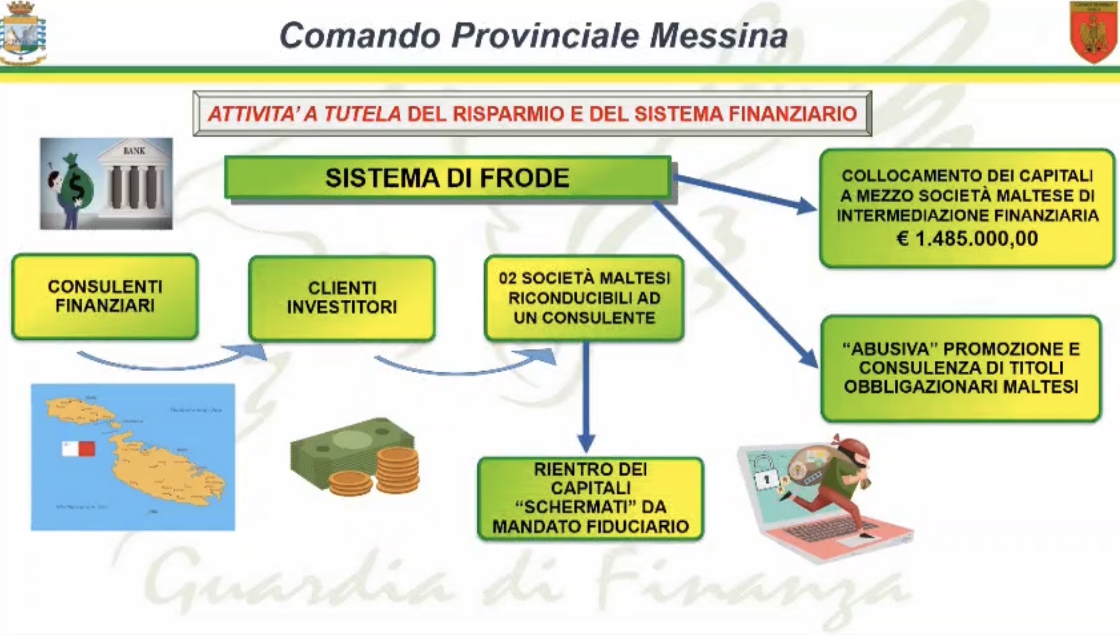 Nei giorni scorsi, su delega della Procura della Repubblica di Messina, i militari del Comando Provinciale della Guardia di Finanza di Messina, hanno dato esecuzione al decreto disequestro di beni per un valore superiore a 1,2 milioni di euro, nei confronti di due soggetti indagati per i reati di truffa ed esercizio abusivo dell'attività finanziarla. II provvedimento di sequestro è stato emesso dal GIP del Tribunale di Messina, su conforme richiesta di questa Procura (Sezione Criminalità economica), che ha coordinato le indagini, delegandole al Nucleo di Polizia Economico-Finanziaria, a cui i due investitori, in qualità di persone offese, avevano denunciato il mancato rimborso dei capitali affidati. I due indagati - operanti, rispettivamente, l'uno, nel messinese, l'altro, in territorio elvetico - sfruttavano la pregressa esperienza professionale nel settore della consulenza finanziaria, per attirare clienti, attraverso la proposta di investimenti nel settore obbligazionario di società maltesi, con la promessa di rendimenti elevati e sicuri. In realtà, i titoli erano riconducibili ad una società facente . . .